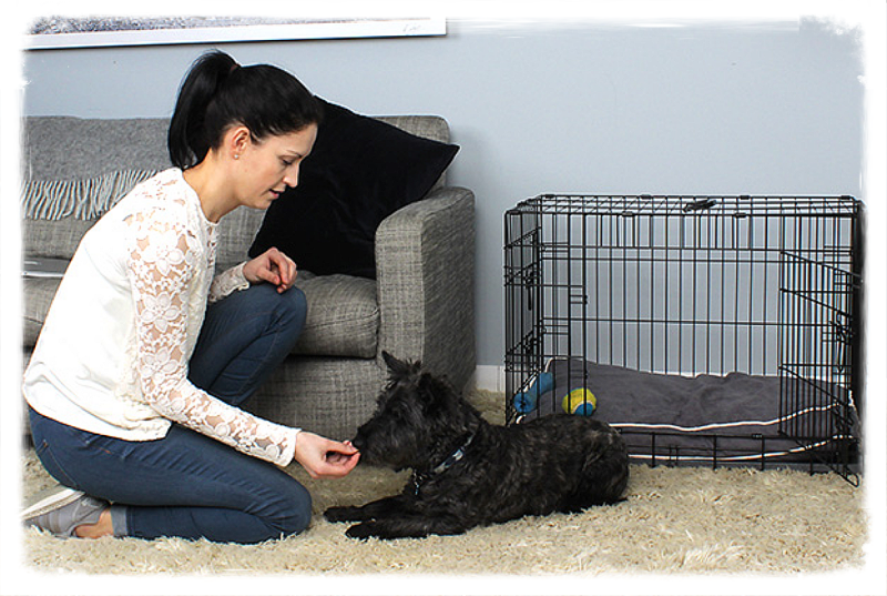 Blijf deze oefening herhalen. - Biedt de maaltijd van uw hond aan in de bench, zijn rustplek.