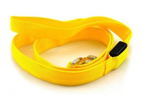 Zie je een hond met een geel doek of een gele lint om zijn nek, een gele lint aan de riem of het tuigje, een geel tuigje/ halsband en riem?